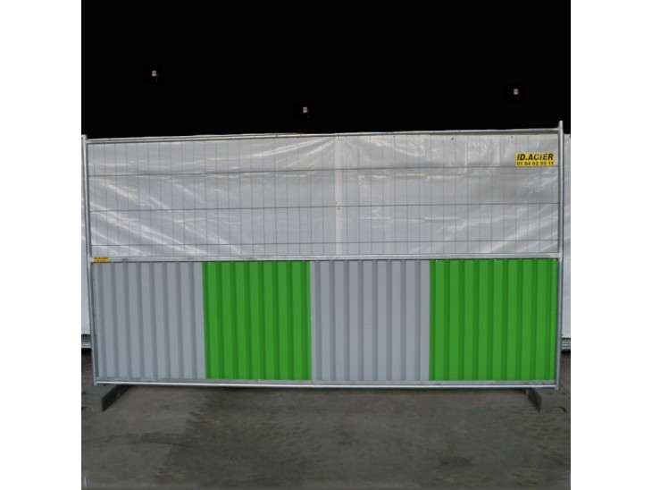 Clôture mobile ID PROTECH à utiliser pour la protection de chantier. Composée d’une partie pleine et d’une partie grillagée qui permet de voir ce qui se passe à l’intérieur et à l’extérieur de la zone de travaux. La partie grillagé peut être recouverte d’une bâche blanche permettant d'occulter la zone de chantier. C'est une barrière mixte qui s’attache facilement aux autres barrières avec des colliers de serrage et se stabilise au sol grâce à des plots adaptés.